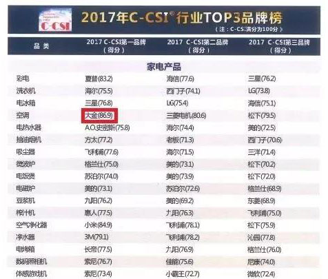 憑借著一貫良好的品牌形象和客戶關系,大金品牌在2017年C-CSI指數(shù)得分為86.9,榮獲空調(diào)行業(yè)排名第一。