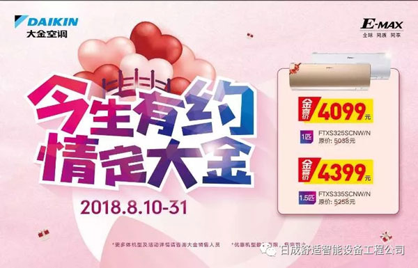花,小禮品,燭光晚餐......OUT了,要送的當(dāng)然送重手的,空調(diào)是你最好的選擇,炎熱天氣可以涼沉沉,心情舒朗,你的愛人會(huì)更愛你喔,小編靜靜的告訴你,大金空調(diào)七夕活動(dòng)來了,精明的你好好把握機(jī)會(huì)喔。